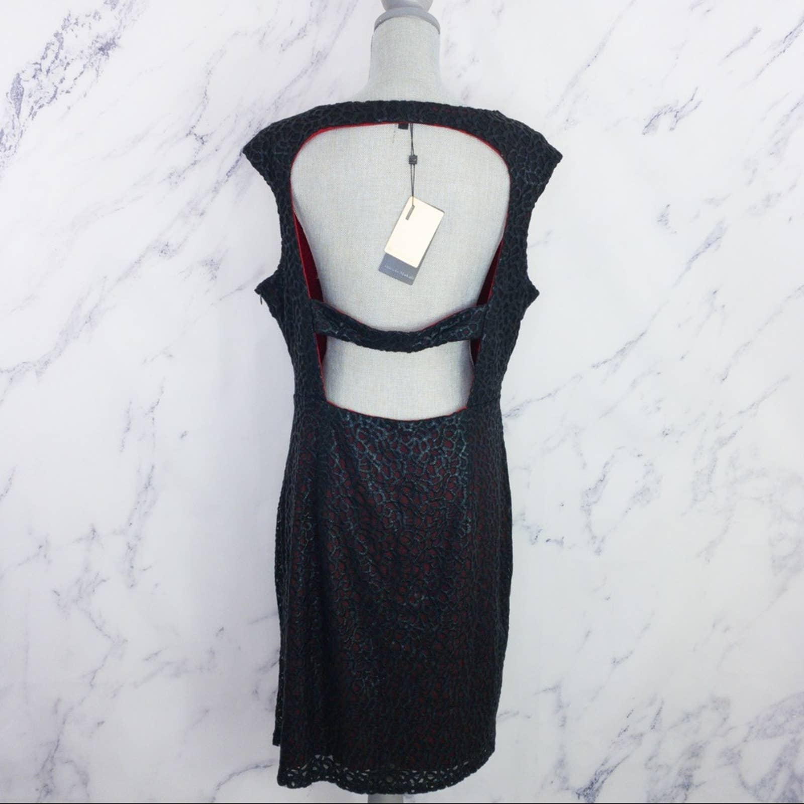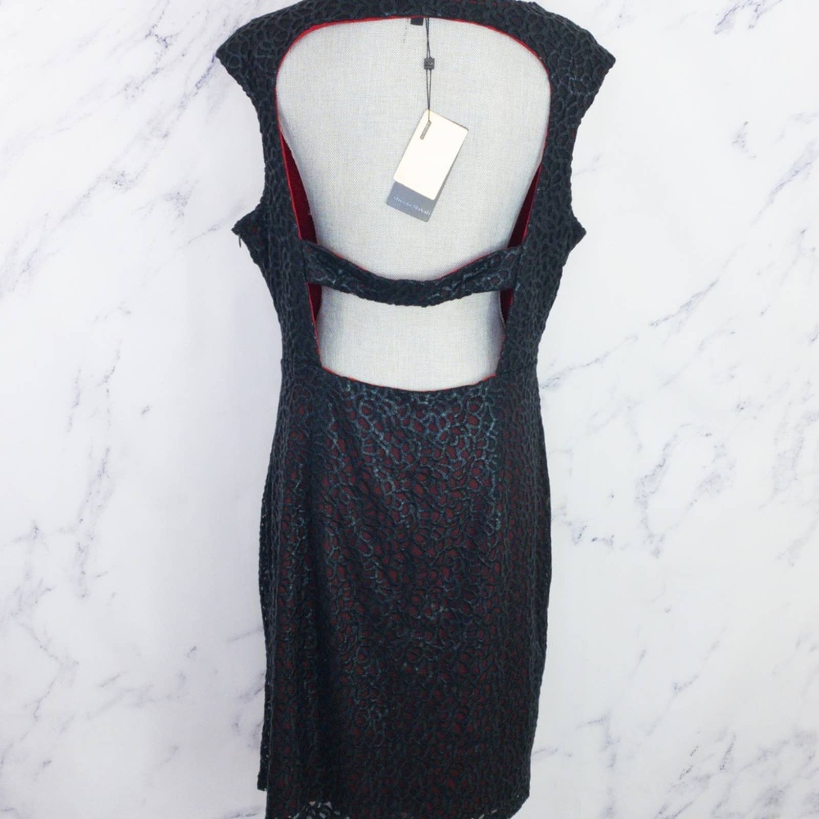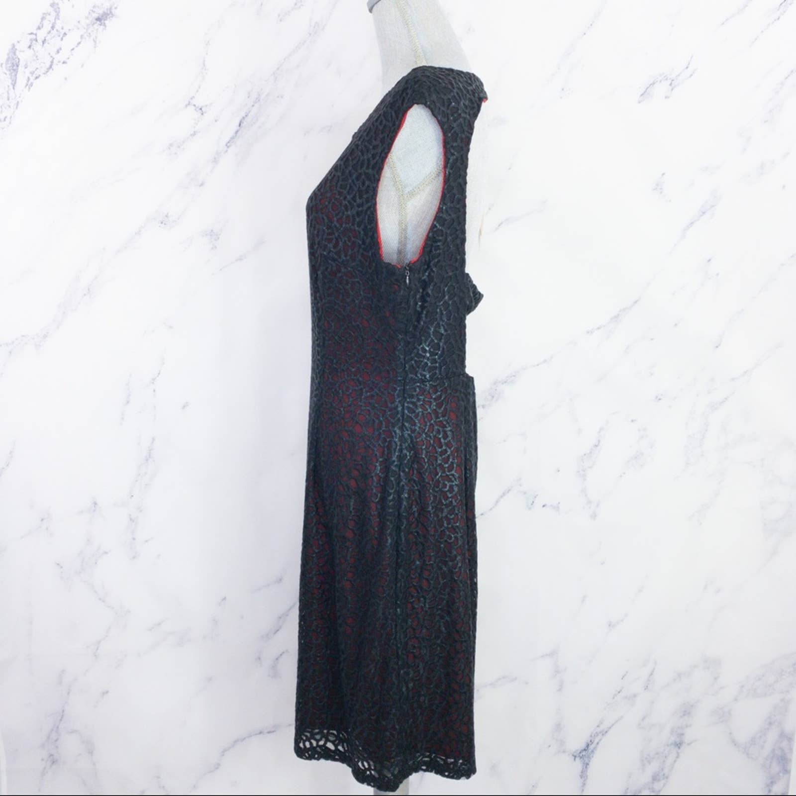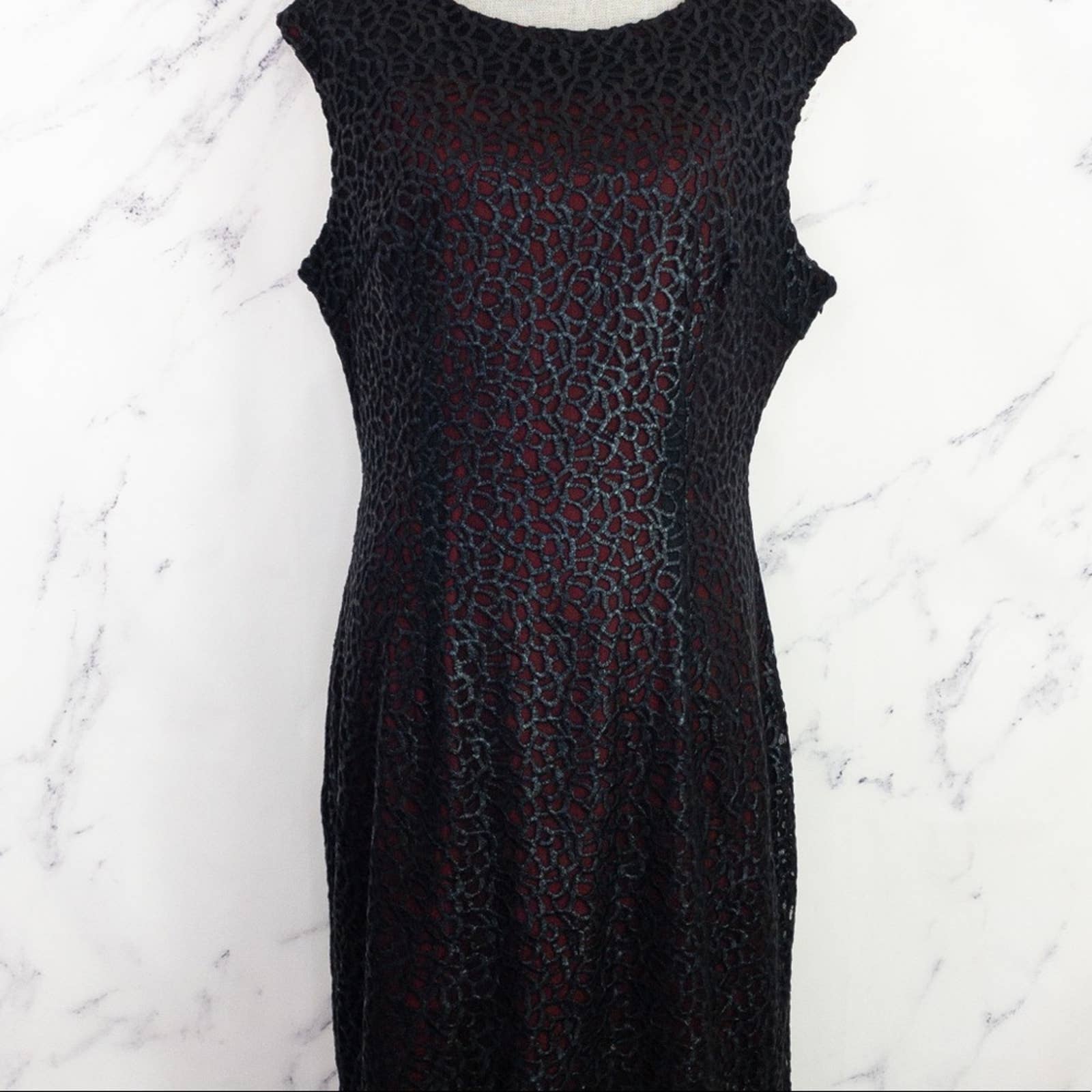 Sheath Dress. Black Lace Overlay. Red Stretch Knit Underlay. Open Back to Waist Line. Side Zipper Closure.
