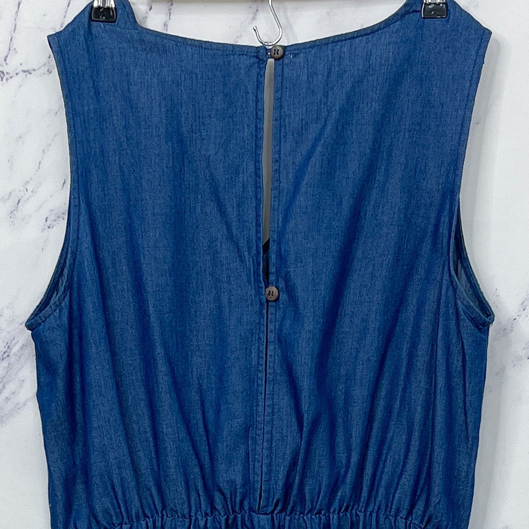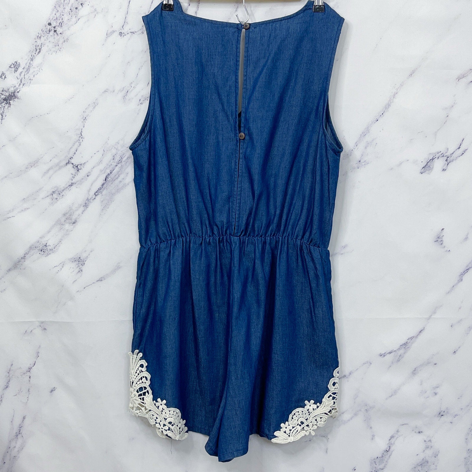 Keywords: Chambray, Romper, Denim Romper, Chambray Romper, Sleeveless Romper, Crochet Romper, Summer, Casual, Resortwear, Vacation
