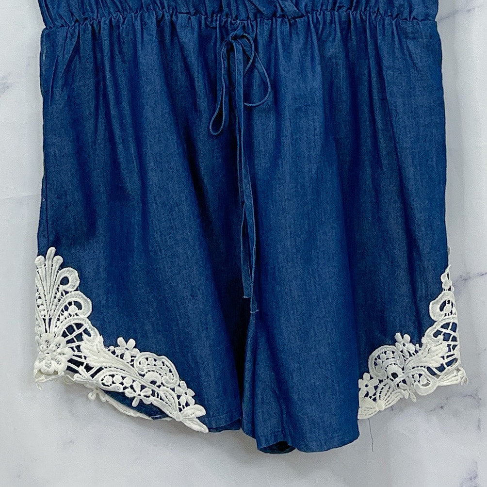 Boutique Chambray Romper with Crochet Detail