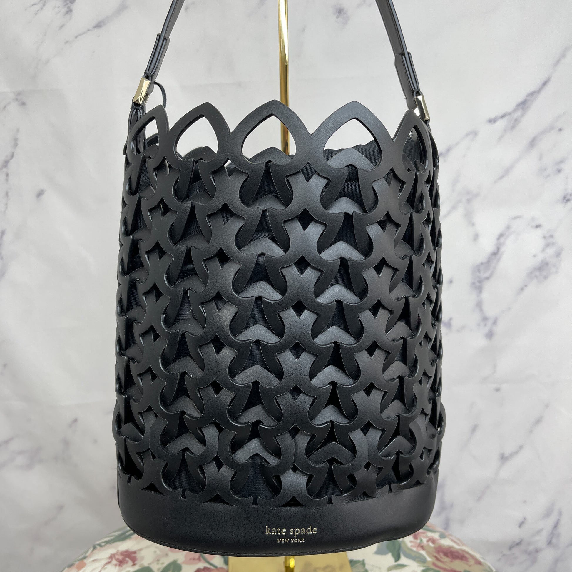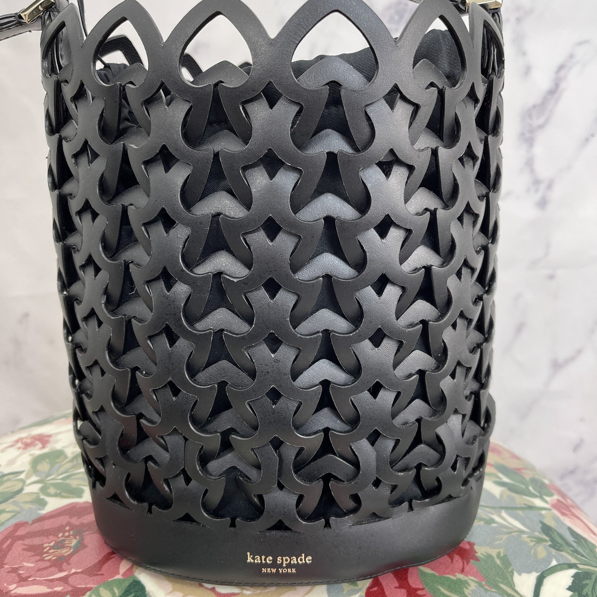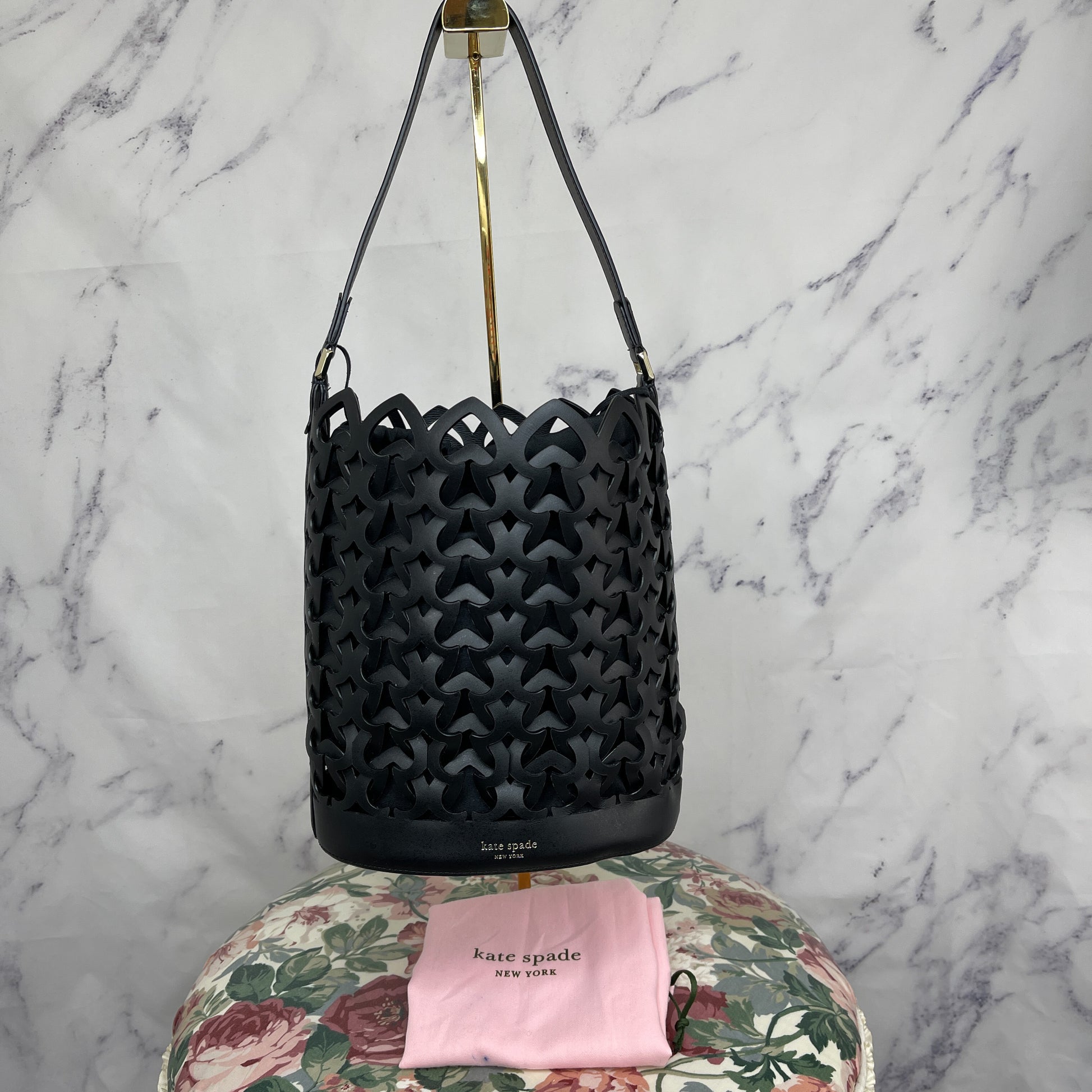 The Kate Spade | Doris Medium Bucket Bag is crafted from supple Italian Leather with bonded smooth texturing and interlocking spades for an upscale look. It has a drawstring pouch interior for added convenience and an embossed foil logo for a signature finish. Measurements are 9.5” length and 11” height. This item is NWOT – brand new and never used – and includes a dust bag.