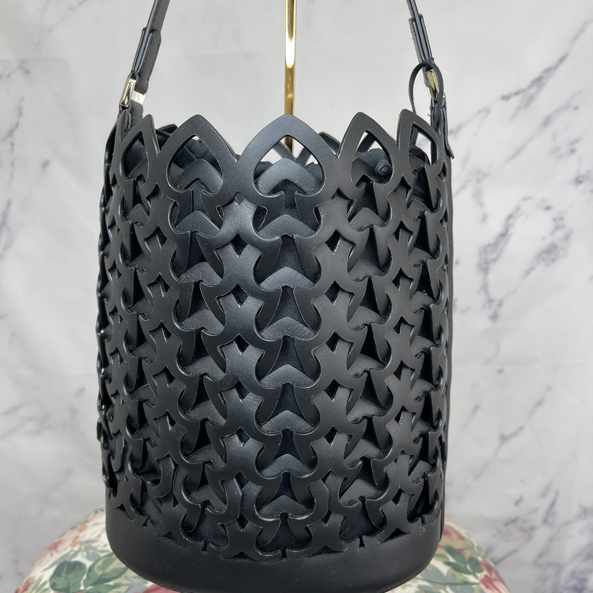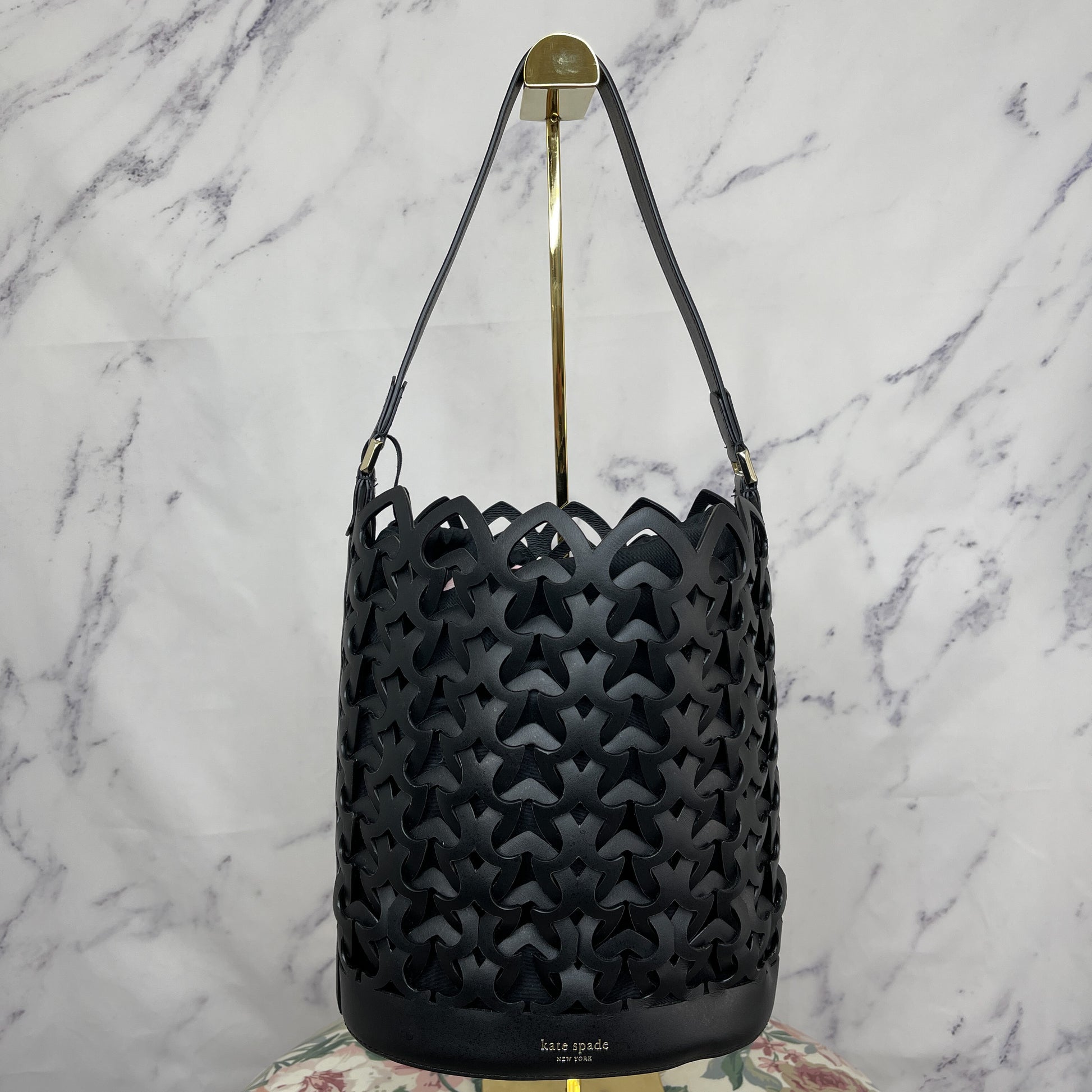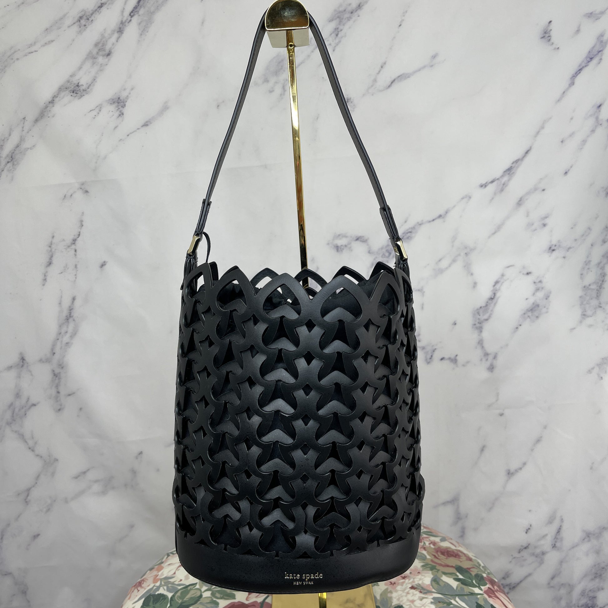 The Kate Spade | Doris Medium Bucket Bag is crafted from supple Italian Leather with bonded smooth texturing and interlocking spades for an upscale look. It has a drawstring pouch interior for added convenience and an embossed foil logo for a signature finish. Measurements are 9.5” length and 11” height. This item is NWOT – brand new and never used – and includes a dust bag.