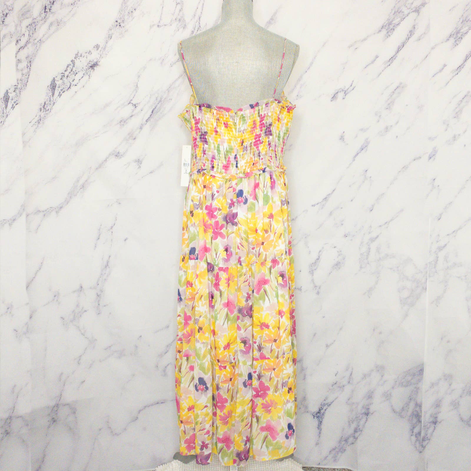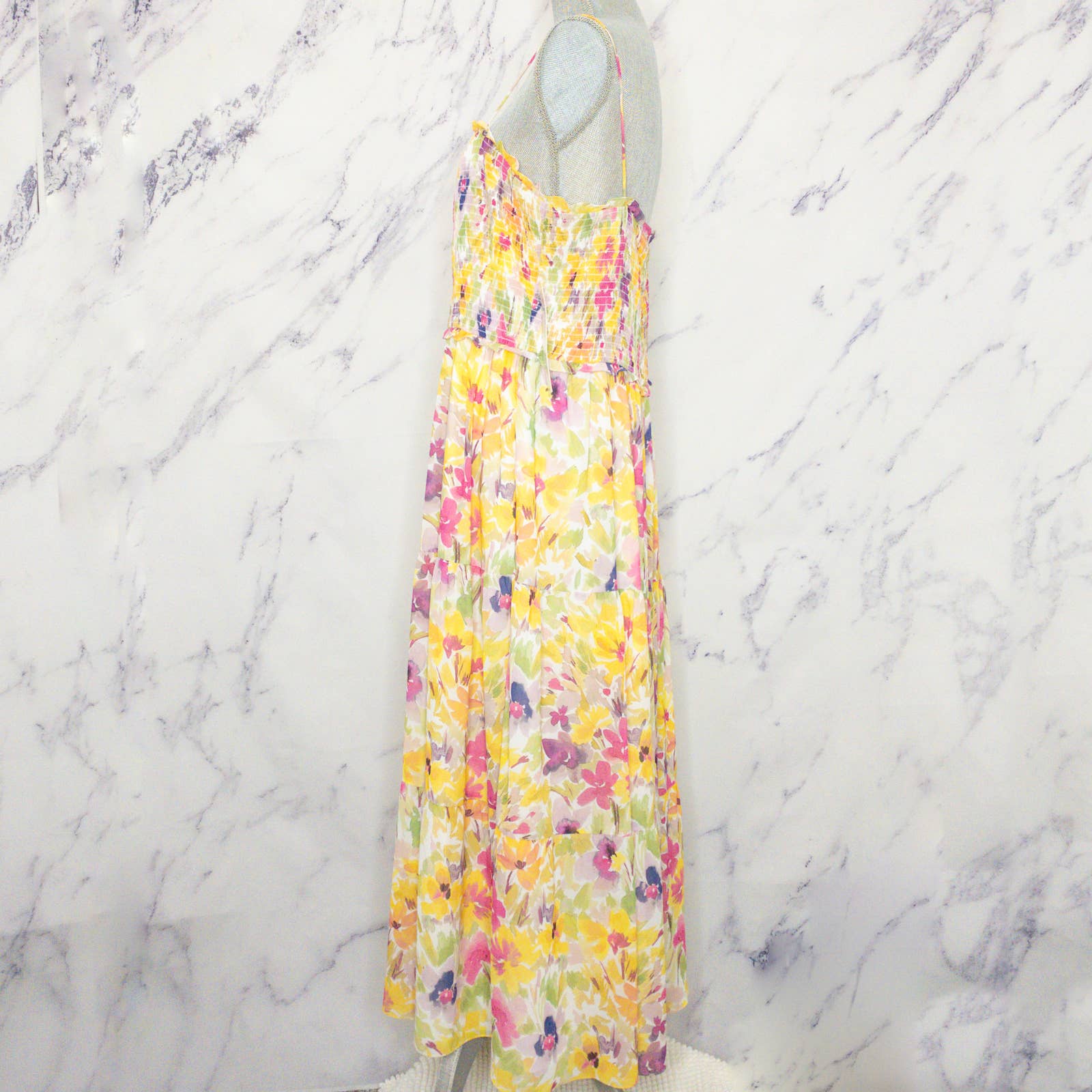 This ML Monique Lhuillier Blooming Field Smocked Midi Dress is a luxurious piece with a bright yellow and multi-colored design. It features spaghetti straps, a floral chiffon fabric, smocked bodice, and a straight neckline. The pullover style allows for easy and comfortable wear. This garment is size 16 and features measurements of 52” in length and 40” in the bust. It is made of 100% polyester and is in brand new, never-worn condition.