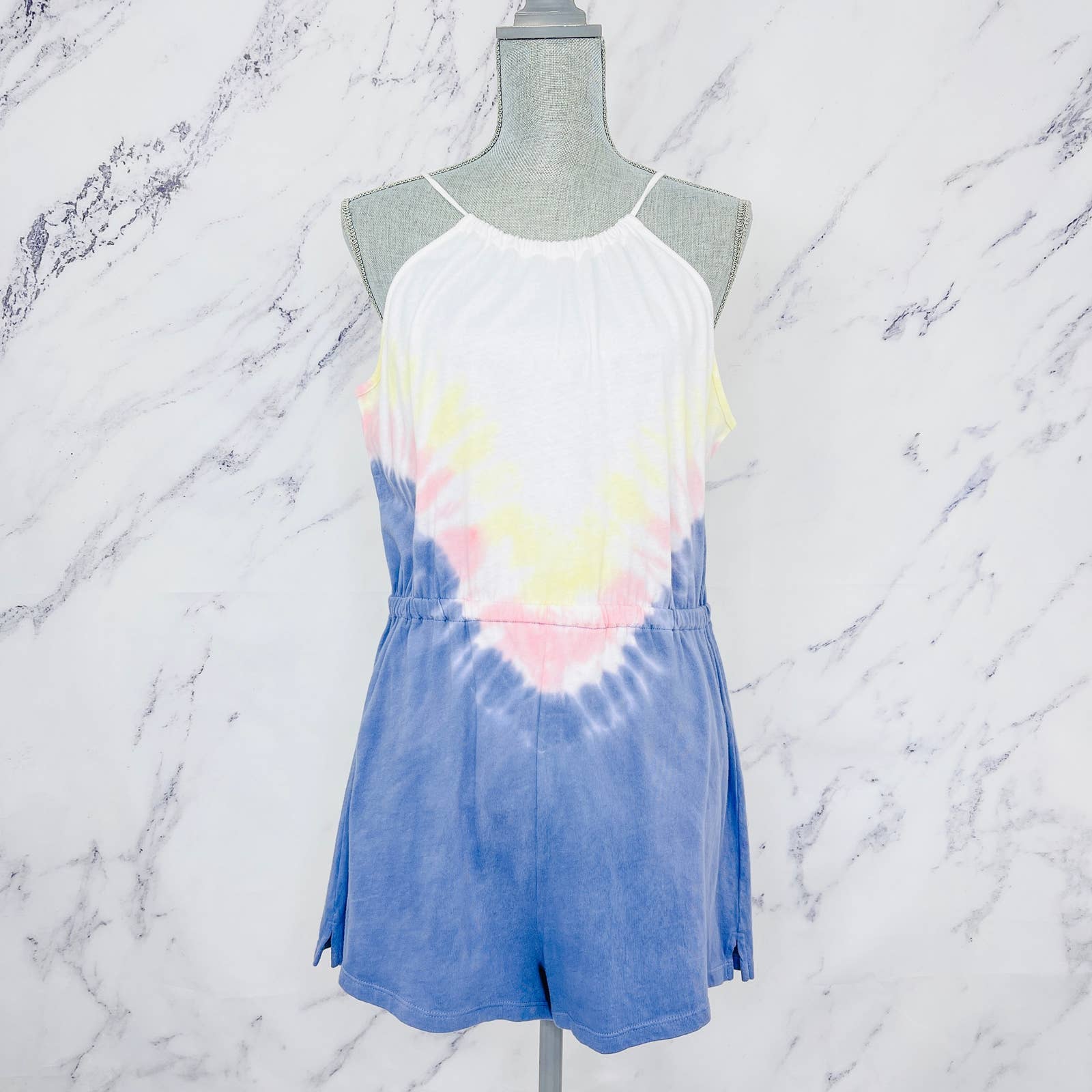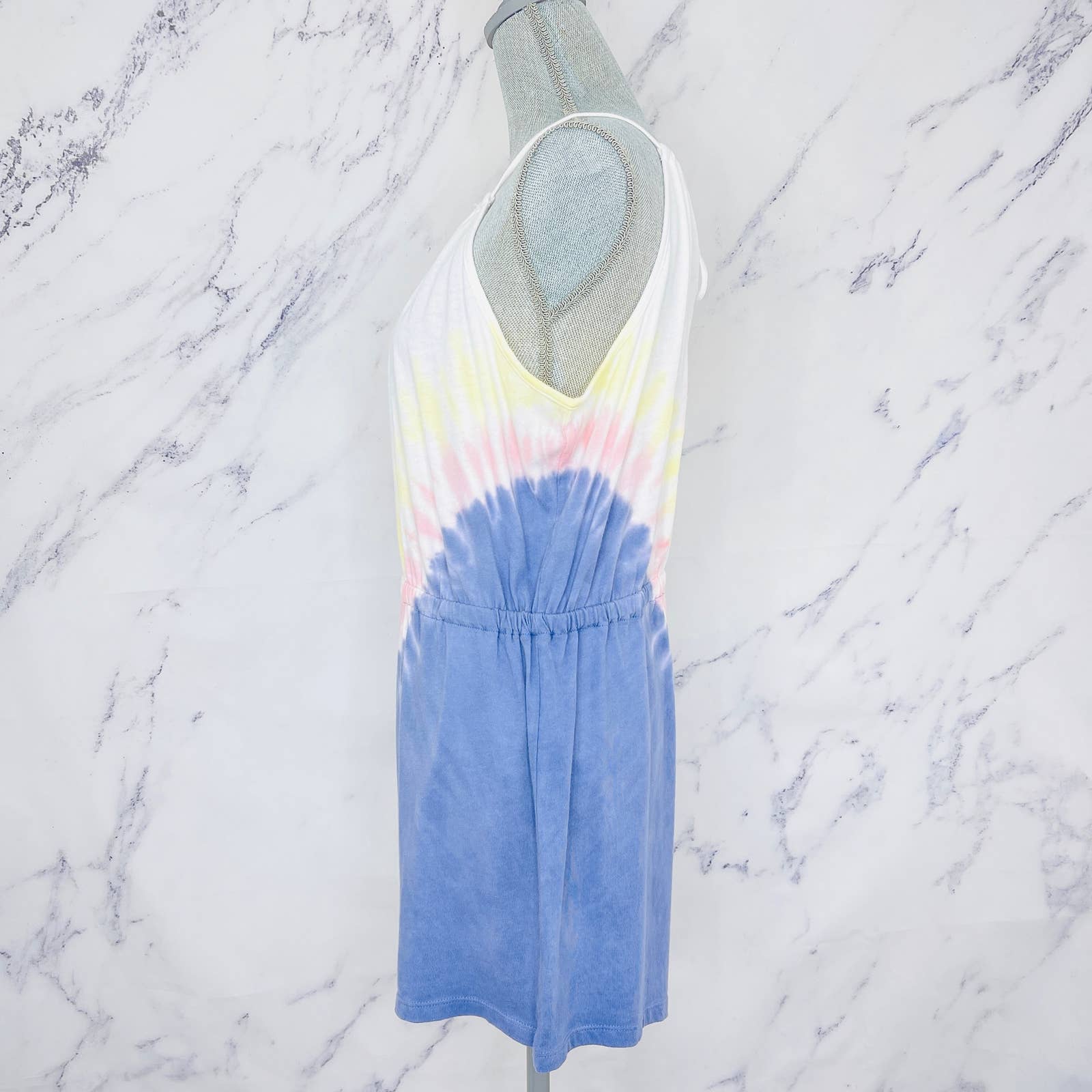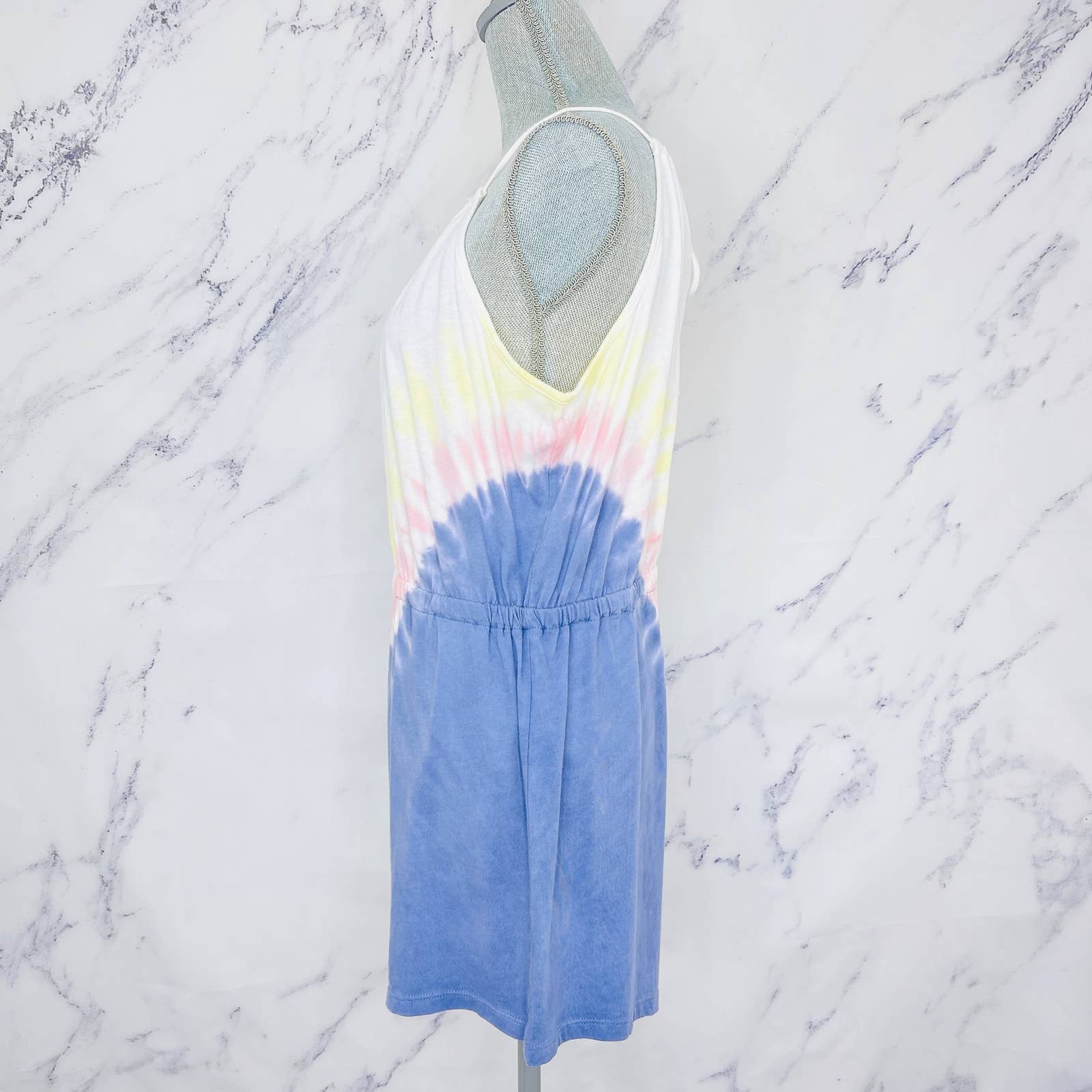 This Wildfox | Edelweiss Playsuit features a shorts romper with cami shoulder straps and an elasticized waist, plus a keyhole back and graphic detailing in white, citron yellow, blush pink and deep periwinkle tie dye. The measurements are 2" inseam, 22.5" pit-to-pit, 17" waist unstretched, and 16" rise. Crafted from 100% cotton, this playsuit is brand new with the tags attached (NWT). MSRP: $118.