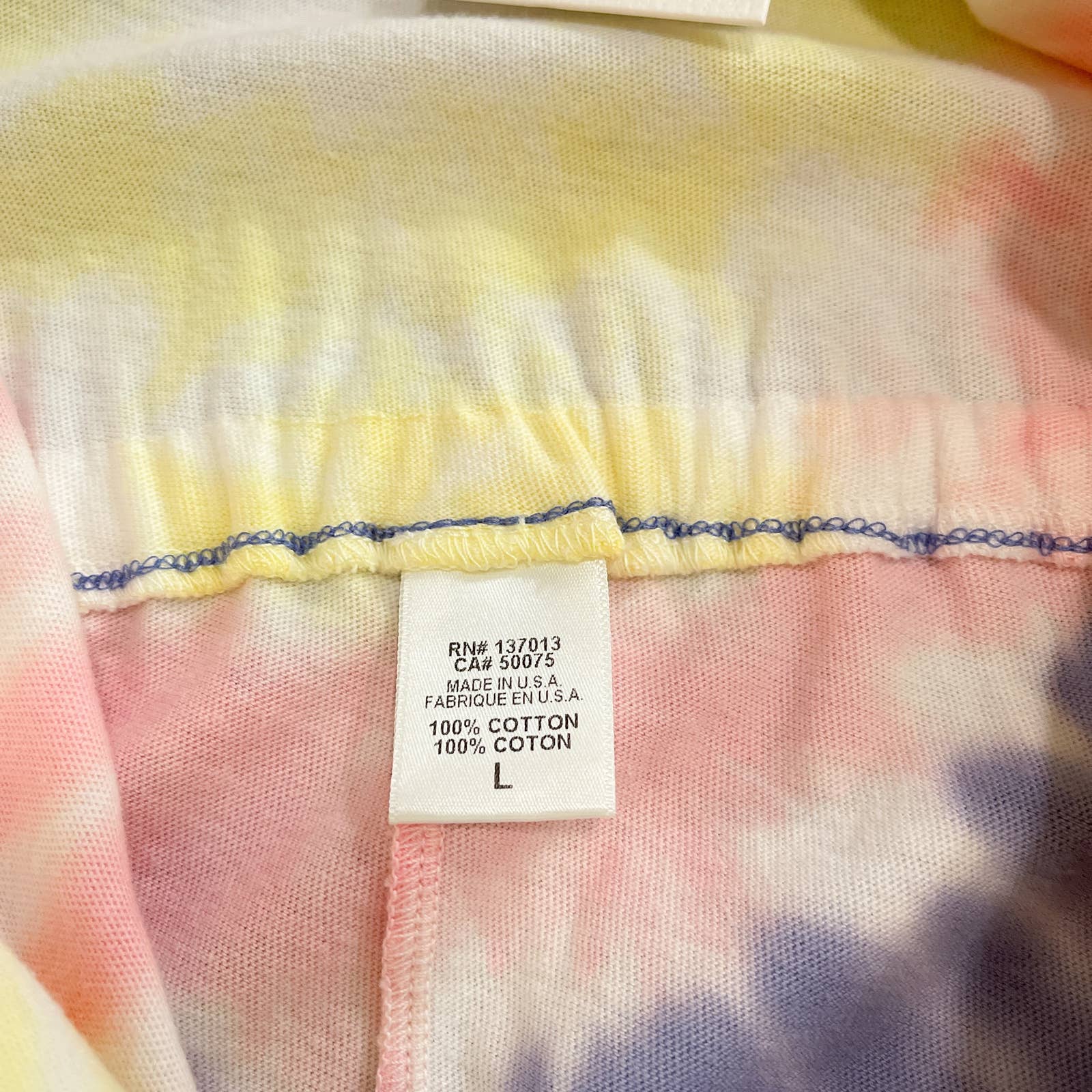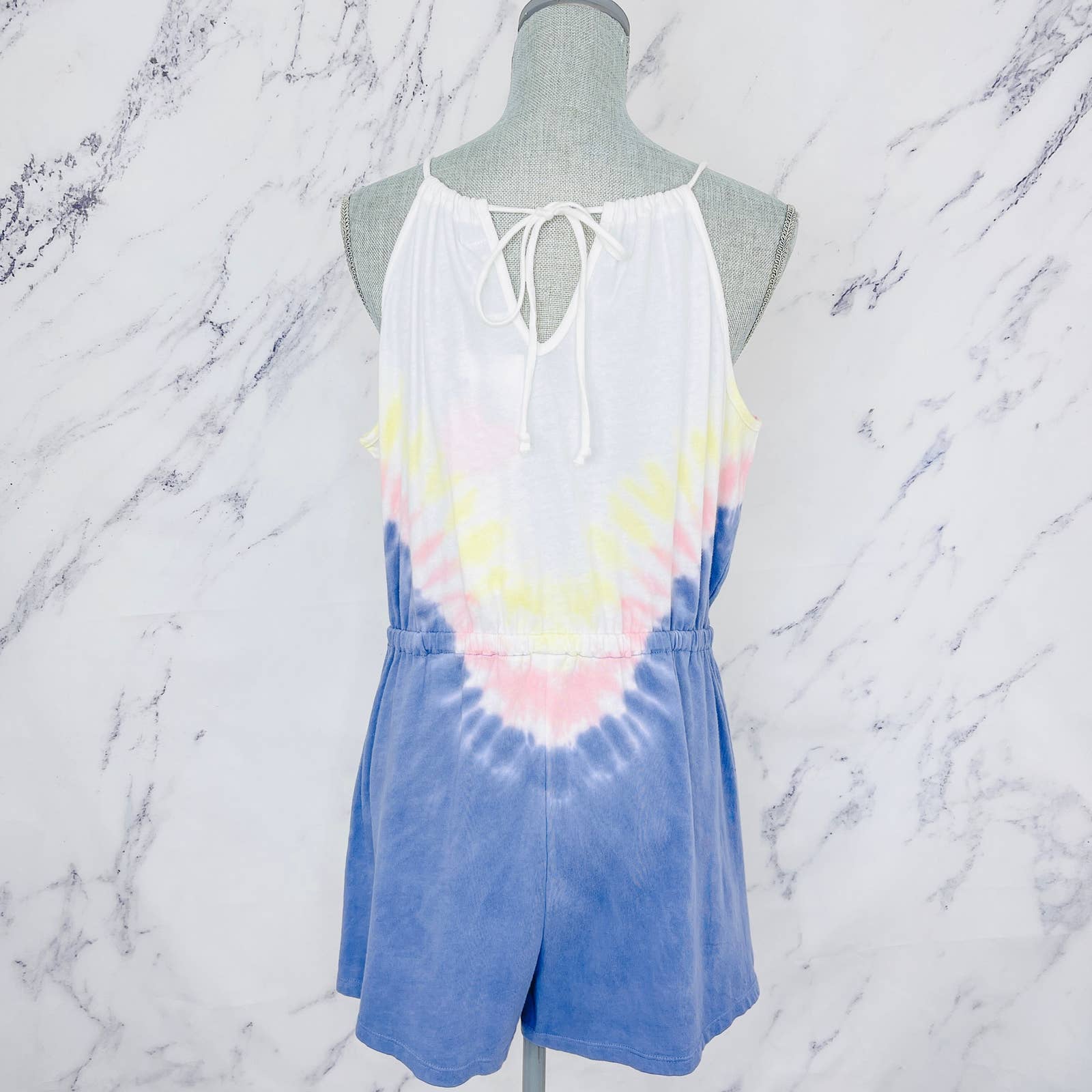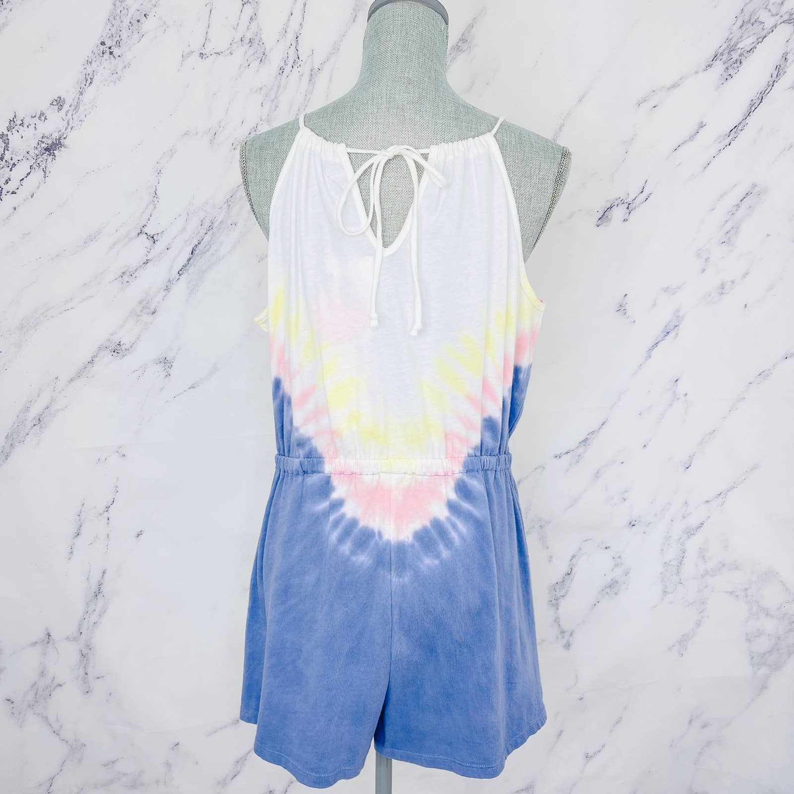 This Wildfox | Edelweiss Playsuit features a shorts romper with cami shoulder straps and an elasticized waist, plus a keyhole back and graphic detailing in white, citron yellow, blush pink and deep periwinkle tie dye. The measurements are 2" inseam, 22.5" pit-to-pit, 17" waist unstretched, and 16" rise. Crafted from 100% cotton, this playsuit is brand new with the tags attached (NWT). MSRP: $118.